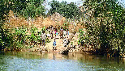 ![]() Kinder am Gambia-Fluss, umrahmt von Bananenstauden und Palmen mit Webervogel-Nestern |